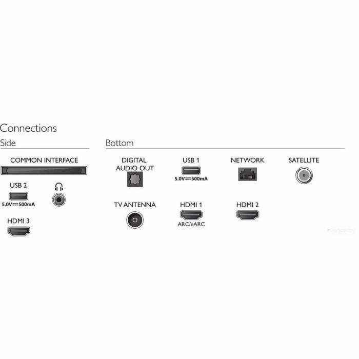 Ethernet - RJ-45, USB Type-A, USB Type-A x 2, вход HDMI, вход HDMI x 3, выход аудио цифровой оптический, выход на наушники, слот CI, слот CI/CI+