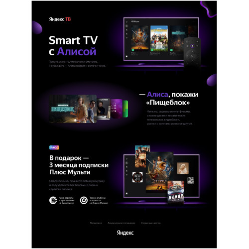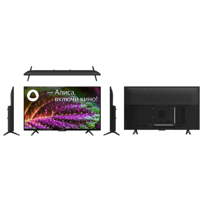 ОсновныеТипЖКДиагональ экрана43"Разрешение1920x1080 (Full HD)Частота матрицы60 ГцИзогнутый экранНетПоддержка 3DНетSmart TVДаПлатформа Smart TVЯндекс. ТВБезрамочный дизайнНетЦвет корпусачерныйЦвет рамкичерныйЦвет подставкичерныйПодставкапо краям Технические характеристикиТип матрицыIPSТехнология подсветкипрямая (Direct LED)Расширенный динамический диапазон (HDR)НетИгровые функцииНетПроцессорARM Cortex-A53Количество ядер процессора4-ядерный ФункцииФоновая подсветкаНетУправление голосом, голосовой поискДа пульт с микрофоном Прием сигналаТВ-тюнерАналоговый, DVB-C, DVB-T, DVB-T2, DVB-S/S2Два тюнераДа АудиосистемаСабвуферНетЗвуковая панель (саундбар)НетМощность звуковой системы20 ВтПоддержка аудиокодеков объемного звукаНетПоддержка HDMI eARCНет ИнтерфейсыBluetoothДаWi-FiДа 802.11n (Wi-Fi 4)Компонентный входДа 1Композитный входДа 1SCARTНетD-Sub (VGA)НетHDMIДа 2 Версия HDMIHDMI 1.4aЦифровой выход S/PDIFДа коаксиальныйВыход на наушникиДа 1USBДа 2Ethernet (LAN)Да 100 Мбит/сAirPlayНетChromecast Built-inНетВыносной блок интерфейсовНет Комплектация3D-очкиНетНастенное креплениеНет Размеры и весКрепление VESAДа 200x100Ширина968 ммВысота (с учетом подставки)615 ммГлубина (с учетом подставки)208 ммВысота (без подставки)568 ммТолщина панели67 мм МеткиМеткинедорогой со Смарт ТВ, для дачи