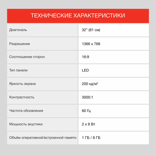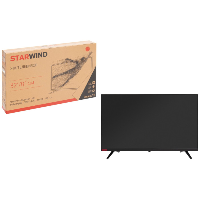 Тип: LED-телевизор Бренд: STARWIND Серия: Яндекс. ТВ Модель: SW-LED32SG300 PartNumber/Артикул Производителя: SW-LED32SG300 Диагональ экрана (дюймы): 32 Диагональ экрана (см): 81 Цвет: черный Разрешение по горизонтали: 1366 Разрешение по вертикали: 768 Стандарт разрешения экрана: HD Частота обновления: 60 Цифровой тюнер DVB-T: ДА Цифровой тюнер DVB-T2: ДА Цифровой тюнер DVB-C: ДА Цифровой тюнер DVB-S: ДА Цифровой тюнер DVB-S2: ДА Поддержка SMART TV: ДА Тип разъема USB: мультимедийный Разъем RJ-45 (Ethernet): 1 Мощность акустики: 10 Класс энергоэффективности: A Диагональ: 32 Покрытие экрана: глянцевое Формат экрана: 16:9 Яркость экрана: 200 Контрастность: 3000:1 Время отклика пикселя: 6.5 Угол обзора горизонтальный: 178 Угол обзора вертикальный: 178 Поддержка CI+/PCMCIA: ДА Поддержка NTSC: ДА Поддержка PAL: ДА Поддержка SECAM: ДА Встроенная акустика: да Количество динамиков: 2 Мощность одного динамика: 5 Декодер Dolby Digital: ДА Процессор изображения: Mali470 triple core Прогрессивная развертка: ДА Цифровое шумоподавление: ДА Встроенный Bluetooth: да Таймер сна: ДА Медиаплеер USB: ДА Форматы воспроизведения: Различные форматы файлов видео, аудио, изображений Антенный вход: 2 Разъем HDMI: 2 Разъем USB: 1 Разъем композитный (видео): 1 Встроенный Wi-Fi: да Разъем CI+: 1 Разъем для наушников: 1 Разъем S/PDIF коаксиальный: 1 Тип блока питания: встроенный Энергопотребление в рабочем режиме: 50 Энергопотребление в режиме ожидания: 0.5 Размер VESA: 200x200 Ширина: 724.3 Высота: 471 Глубина: 180.5 Вес: 3.9 Ширина без подставки: 724.3 Высота без подставки: 425 Глубина без подставки: 87.8 Вес без подставки: 3.8 Комплектация: Полную комплектацию товара уточняйте у производителя Покрытие корпуса: матовое Операционная система: Яндекс. ТВ Тип панели: LED Голосовое управление: ДА Технология HDMI ARC: ДА Технология HDMI-CEC: ДА Тип подставки: по бокам Объем встроенной памяти: 8 Объем оперативной памяти: 1 Голосовой помощник: Яндекс Алиса Тип пульта ДУ в комплекте: Bluetooth Цвет для фильтра: черный Тип для Ситилинка: Телевизор Подсветка: LED Операционная система: Яндекс. ТВ Поддерживаемые стандарты изображения: NTSC, PAL, SECAM Тип звукового декодера: Dolby Digital Технологии HDMI: HDMI ARC, HDMI-CEC Страна производства: Беларусь Разрешение: 1366x768 Цвет телевизора: черный Углы обзора (гориз/верт): 178x178 Размеры: 724.3x471x180.5мм Размеры без подставки: 724.3x425x87.8мм Длина упаковки (ед): 0.76 Ширина упаковки (ед): 0.11 Высота упаковки (ед): 0.46 Габариты упаковки (ед) ДхШхВ: 0.76x0.11x0.46 Вес упаковки (ед): 5 Объем упаковки (ед): 0.038456 Номер партии: SW-LED32SG300 Производитель: STARWIND Код производителя: SW-LED32SG300 Гарантия: 12