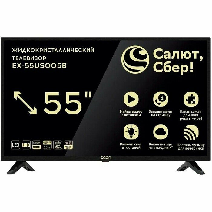 Модель - EX-55US005B, UHD 4K SMART 55" Sber TV Диагональ: 55" (140 см) Цифровой тюнер DVB-T2/DVB-C (H.265H.264 MPEG 412 Video) USB медиаплеер с поддержкой MKV видео Система шумоподавления Усиление слабого сигнала Формат экрана: 16:9 Формат изображения: 16:9; 4:3 Разрешение экрана: потенциальное 3840(Г) x 2160(В) Динамическая контрастность: 160000:1 3D цифровой фильтр Яркость: 300 кд/м2 Угол обзора (Г/В): 178°/178° Время отклика: 6.5 мс Аудио: 2 х 8 Вт Встроенный контроллер беспроводного доступа Wi-Fi Операционная система Sber OS Процессор ARM Cortex A53 Quad Core DDR 1,5 Гб Flash 8 Гб Разъемы для подключения: аудио/видео вход, 2хUSB, 3хHDMI, AV вход, RJ45, выход для наушников, вход для антенны, вход CI (common interface).