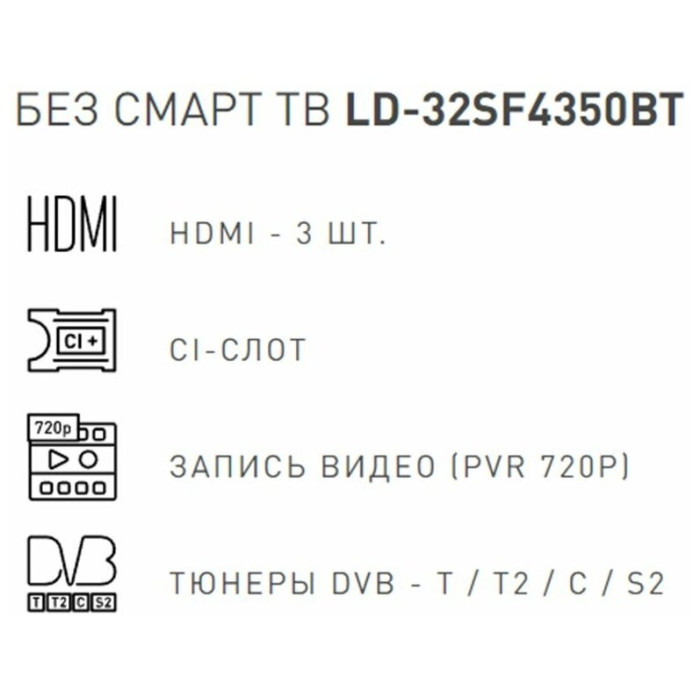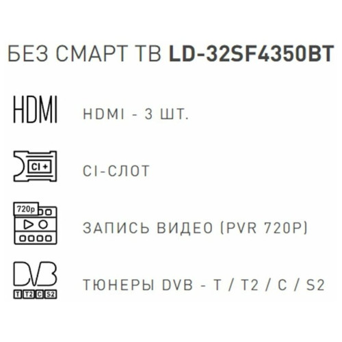 32 дюйма отличаются высоким качеством изображения формата FullHD и разнообразными вариантами подключения к источникам сигнала, что позволяет использовать телевизор в качестве монитора. Улучшенная конструкция динамиков мощностью 20 Вт добавит еще больше звучания кинофильмам и телепере- дачам. Два независимых тюнера DVB-T-T2-C и DVB-S2, а также CI слот позволят обойтись без дополни- тельных ТВ-приставок и использования второго пульта – для доступа нужна лишь карта провай- дера и САМ модуль. DVB - T - T2 - С - S2 разрешение 1920х1080 запись программы на внешний носитель, встроенный медиаплеер, угол обзора 178-178 град. Яркость 200кд-м2, Контрастность 300: 1