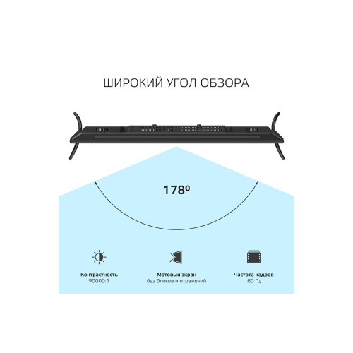 диагональ экрана 43", разрешение 3840х2160, частота обновления экрана 60 Гц, время отклика пикселя 8 мс, яркость 250 кд/м2, цифровые тюнеры DVB-T, DVB-T2, DVB-C, встроенная акустика 16 Вт (2x8 Вт), Ethernet RJ-45, Wi-Fi, Bluetooth, Smart TV, YaOS, Android 11