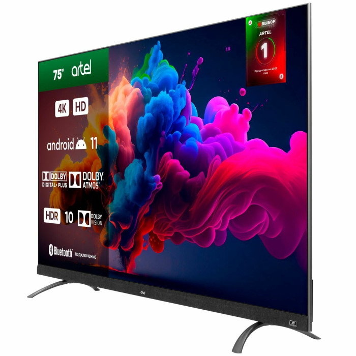 Телевизор Artel A75LU6500 обладает 75-дюймовым (190 см) экраном формата 16:9, который отображает детализированное изображение в разрешении 2160х3840 пикселей. Модель оснащена технологией Smart TV, благодаря чему становится доступно большое количество приложений для установки на внутреннюю память прибора, появляется возможность поиска и просмотра контента в Сети. В устройстве реализована система обработки изображения — масштабирование до 4K Ultra HD и цифровое шумоподавление, исключающее вероятность возникновения искажений и помех.