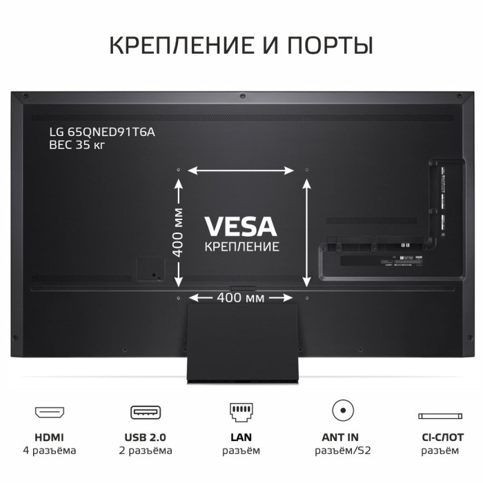 Ethernet - RJ-45, USB Type-A, вход HDMI, слот CI/CI+, S/PDIF, Антенный вход (RF)
