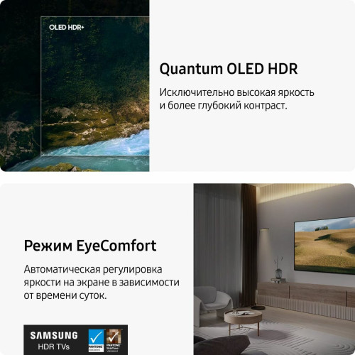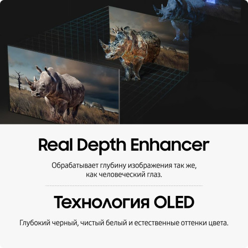Телевизор Samsung 65" OLED 4K S90D погрузит вас в глубокие, чистые и естественные цвета. Технология Real Depth Enhancer передает всю глубину сцены, имитируя процесс фокусировки человеческого глаза на реальных объектах, а HDR+ раскрывает более широкий диапазон контрастности. Режим EyeComfort регулирует яркость предметов в зависимости от времени суток, снимая усталость и напряжение с глаз. Также в умном телевизоре используются подлинные цвета по классификации PANTONE. Теперь вы можете полностью погрузиться в атмосферу, происходящего на экране. Оцените непревзойденное качество Смарт ТВ благодаря обновленному интеллектуальному процессору, который масштабирует каждую сцену до разрешения 4K. Система Smart Hub актуализирует подбор контента под ваши потребности, благодаря чему можно сразу приступить к просмотру фильмов, игр или любимых шоу, не тратя время на поиск. Поддержка Dolby Atmos и Object Tracking Sound Lite с верхнеканальными динамиками создают многомерный объемный звук, следующий за движением объекта на экране. Q-Symphony поможет усилить звучание и позволяет колонкам ТВ и саундбара* работать синхронно, гарантируя более гармоничное звуковое сопровождение. Одолейте любого врага в самой динамичной битве благодаря улучшенной передаче движения в формате 4К 144 Гц и наслаждайтесь плавностью переходов без задержек и размытий. Поддержка форматов 21:9 и 32:9 гарантирует сверхширокий обзор, а удобная игровая панель позволит в реальном времени менять настройки в играх. Минималистичный тонкий профиль телевизора OLED 4K S90D будет радовать вас изо дня в день! *Проверьте совместимость с функцией Q-Symphony в технических характеристиках саундбара.**Саундбар приобретается отдельно