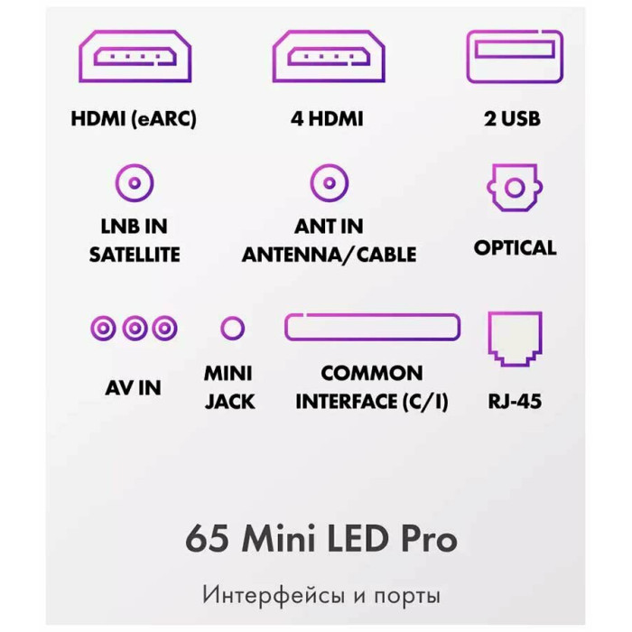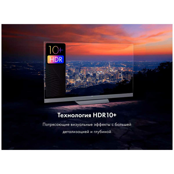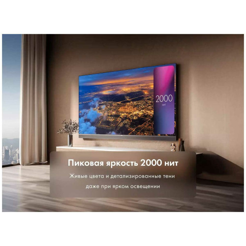 Общие данные: Габариты (без подставки): 87.4х144.8х7.9 см Габариты (с подставкой): 91.4х144.8х26.5 см Диагональ: 65" (164 см) Соотношение сторон: 16:9 Разрешение: 4K UHD 3840 х 2160 Разъемы (вход): HDMI х 4, USB х 2, антенный х 2, композитный, CI+, аналоговый аудио, Ethernet Разъемы (выход): выход для наушников Изображение: Технология экрана: mini LED Тип подсветки: mini LED Частота обновления: 144 Гц Время отклика: 6.5 мс Яркость: 600/2000 кд/м² Контрастность: 7000:1 Угол обзора: 178/178 ° Количество зон локального затемнения: 576 Dolby Vision IQ Цифровое шумоподавление MEMC HDR 10 HDR10+ Системы вещания: DVB-T DVB-T2 DVB-S2 DVB-S DVB-C Система аналогового ТВ: PAL/SECAM Звук: Тип колонок: стерео Суммарная выходная мощность аудио: 60 Вт Dolby Atmos Эквалайзер DBX-TV Объемный звук Dolby Digital Decoding HDMI ARC Harman Kardon Сабвуфер SMART TV : Операционная система: Android TV 11.0 Сетевые функции: Wi-Fi, Bluetooth 5.2 Версия Wi-Fi: 5 Гц Поддержка YouTube Поддержка Google Play Store Особенности: Энергопотребление: 360 Вт Цвет лицевой панели: серый Голосовое управление без пульта Far Field Time Shift Таймер Вкл/Выкл Воспроизведение с USB носителя Родительский контроль Вес: 21.5 кг без подставки, 22.5 кг с подставкой В комплекте: Пульт HTR-U35R, шнур питания, руководство пользователя, гарантийный талон, подставка Крепление на стену VESA (мм): 300х400 Внимание: крепление в комплект не входит и приобретается отдельно!