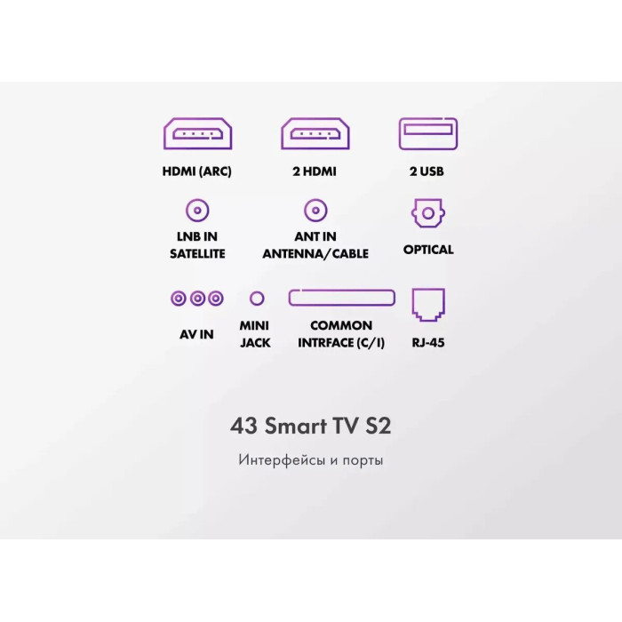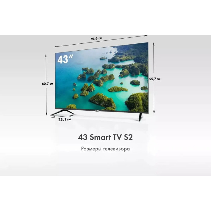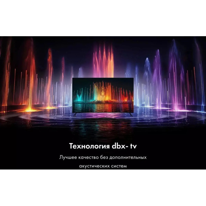 Общие данные: Габариты (без подставки): 55.7х96.1х7 см Габариты (c подставкой): 61х96.1х20.8 см Диагональ: 43" (110 см) Разрешение: 3840x2160 Время отклика (мс): 8.5 Яркость (кд/м²): 250 Контрастность: 5000:1 Угол обзора: 178/178 ° Разъемы (вход): HDMI 2.1 х 4, USB 2.0 х 2, антенный х 2, CI+ слот, аналоговый аудио, Ethernet Разъемы (выход): оптический, для наушников Изображение: Тип подсветки: Direct LED Формат экрана: 16:9 Частота обновления (Гц): 60 Цифровое шумоподавление MEMC HDR 10 Upscaling 4K UHD Системы вещания: DVB-T2 DVB-S2 Система аналогового ТВ: PAL/SECAM Звук: Тип колонок: cтерео Суммарная выходная мощность аудио (Вт): 19 Эквалайзер DBX-TV Объемный звук Dolby Digital Decoding HDMI ARC Smart TV: Операционная система: Android TV 11.0 Поддержка YouTube Поддержка Google Play Store Голосовой поиск Wi-Fi встроенный Версия Wi-Fi, Гц: 5 Особенности: Bluetooth 5.1 Стойка: ножки по бокам Таймер Вкл/Выкл Воспроизведение с USB носителя Родительский контроль Запись на USB HDMI CEC Пульт: HTR-U32R Потребляемая мощность: 90 Вт Вес: 6.43 кг без подставки, 6.5 кг с подставкой Крепление на стену VESA (мм): 200х200 Внимание: крепление в комплект не входит и приобретается отдельно!