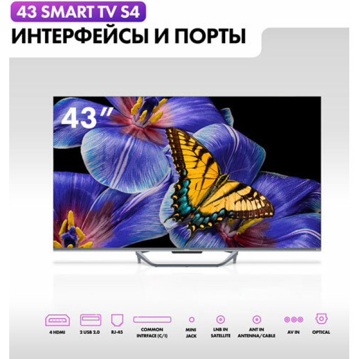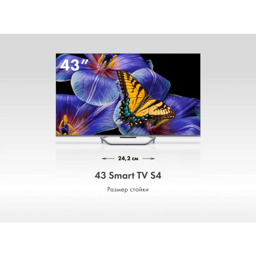 Общие данные: Габариты (без подставки): 55.6х95.7х8.22 см Габариты (с подставкой): 60.95х95.7х24.07 см Диагональ: 43" (109 см) Соотношение сторон: 16:9 Разрешение: 3840х2160 Яркость: 320 кд/м2 Контрастность: 6000:1 Угол обзора: 178/178 ° Время отклика: 6.5 мс Разъемы (вход): HDMI 2.1 х 4, USB 2.0 х 2, антенный, композитный, CI+, аналоговый аудио, Ethernet Разъемы (выход): выход для наушников Изображение: Тип подсветки: HQLED Частота обновления: 60 Гц HDR-Dolby Vision Цифровое шумоподавление MEMC HDR 10 Upscaling 4K UHD Системы вещания: DVB-T DVB-T2 DVB-C DVB-S DVB-S2 Система аналогового ТВ: PAL/SECAM Звук: Тип колонок: стерео Суммарная выходная мощность аудио: 40 Вт Dolby Atmos Эквалайзер DBX-TV Объемный звук Dolby Digital Decoding SMART TV : Операционная система: Android TV 11.0 Сетевые функции: Wi-Fi, Bluetooth 5.1 Версия Wi-Fi: 5 Гц Поддержка YouTube Поддержка Google Play Store Голосовой поиск Особенности: Энергопотребление: 105 Вт Цвет лицевой панели: серый Голосовое управление без пульта Far Field Таймер Вкл/Выкл Воспроизведение с USB носителя Родительский контроль Запись на USB HDMI CEC Вес: 7.2 кг без подставки, 7.45 кг с подставкой Крепление на стену VESA (мм): 300х300 Внимание: крепление в комплект не входит и приобретается отдельно!