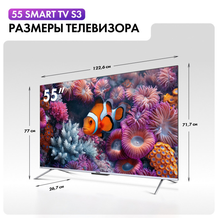 Общие данные: Габариты (без подставки): 122.6 x 71.7 x 8.4 см Габариты (с подставкой): 122.6 x 77 x 26.7 см Диагональ: 55"(139.7 см) Разрешение: 3840x2160 Изображение: Формат экрана: 16:9 Тип технологии HDR: Dolby Vision Системы обработки изображения: масштабирование до 4K Ultra HD, цифровое шумоподавление Технология экрана HQLED MEMC Upscaling 4K UHD Интерфейсы: Разъемы (вход): 4 х HDMI 2.1, 2 х USB 2.0 тип A, 1 х RCA аудио, 1 х RCA аудио/видео, 1 х RCA видео композитный, 1 х 3.5 мм аудио, 1 х 3.5 мм аудио/видео, 1 х DVB CAM, 1 х LAN разъем (RJ45) Разъемы (выход): 1 х 3.5 мм аудио, 1 х выход оптический (Toslink), 1 х 3.5 мм аудио/видео, 1 х RCA аудио, 1 х RCA аудио/видео, 1 х разъем для наушников 3.5 мм Системы вещания: Цифровой тюнер DVB: T/T2/S2/C Звук: Количество динамиков: 2 Суммарная выходная мощность аудио (Вт) 26 Dolby Atmos Эквалайзер dbx tv Объемный звук Dolby Digital Decoding SMART TV: Встроенный модуль Bluetooth 5.1 Wi-Fi Операционная система: Android 11 Поддержка YouTube Поддержка Google Play Store Голосовой поиск Энергопотребление: Энергопотребление в рабочем режиме: 170 Вт Особенности: Голосовое управление без пульта Far Field Time Shift Таймер Вкл/Выкл Воспроизведение с USB носителя Родительский контроль Запись на USB HDMI CEC Настенный адаптер VESA (мм) 400 x 300 Вес: 10.85 кг Вес без подставки: 10.65 кг Тип батарей пульта ДУ: 2 х AAA