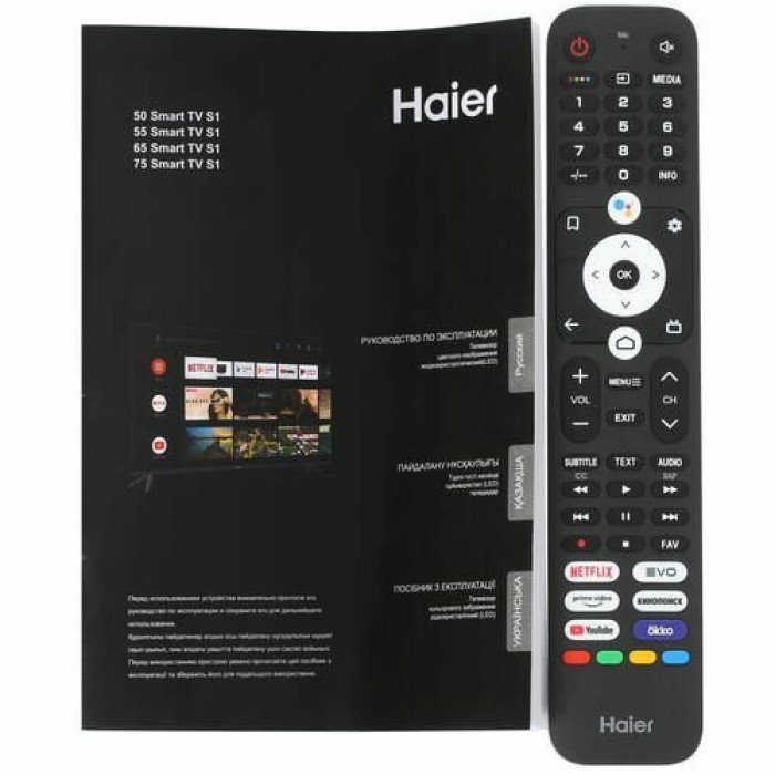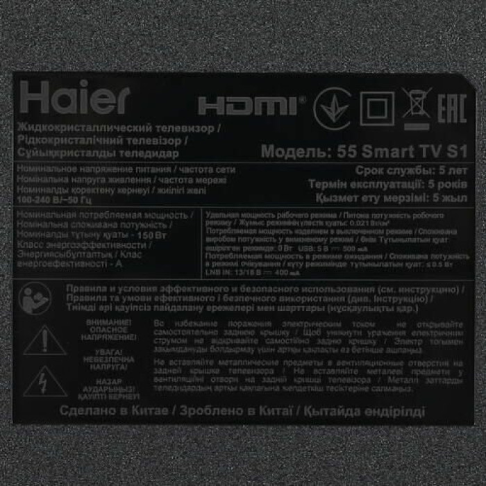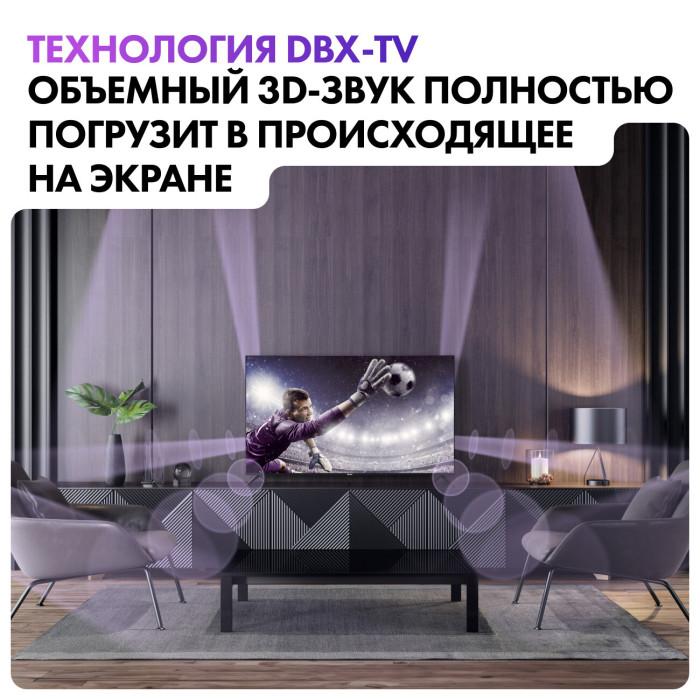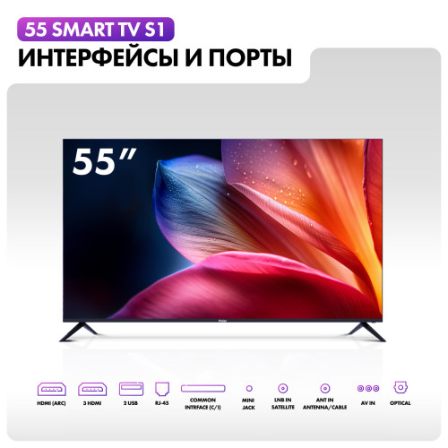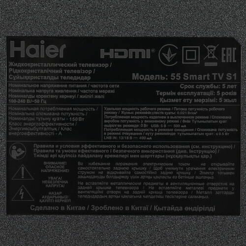 Общие данные: Габариты (без подставки): 72х123.1х8.2 см Габариты (с подставкой): 77.4х123.1х26.5 см Ширина подставки: 90 см Диагональ: 55"(139.7 см) Разрешение: 3840x2160 Изображение: Формат экрана: 16:9 Частота обновления: 60 Гц Тип технологии HDR: HDR10 Системы обработки изображения: масштабирование до 4K Ultra HD, цифровое шумоподавление Интерфейсы: Разъемы (вход): 4 х HDMI 2.1, 2 х USB 2.0 тип A, 1 х RCA аудио, 1 х RCA аудио/видео, 1 х RCA видео композитный, 1 х 3.5 мм аудио, 1 х 3.5 мм аудио/видео, 1 х DVB CAM, 1 х LAN разъем (RJ45) Разъемы (выход): 1 х 3.5 мм аудио, 1 х выход оптический (Toslink), 1 х 3.5 мм аудио/видео, 1 х RCA аудио, 1 х RCA аудио/видео, 1 х разъем для наушников 3.5 мм Системы вещания: Цифровой тюнер DVB: T/T2/C/S2 Звук: Звук: NICAM стерео Фронтальные акустические системы Количество динамиков: 2 Мощность одного динамика: 10 Вт SMART TV: Встроенный модуль Bluetooth 5.1 Wi-Fi 5 Ггц Операционная система: Android 11 Энергопотребление: Энергопотребление в рабочем режиме: 150 Вт Энергопотребление в режиме ожидания: 0.5 Вт Особенности: Android TV Google Assistant DBX-TV Поддержка Smart TV Технология HDR Запись с ТВ на USB устройство Sleep-таймер Встроенные часы Функция TimeShift Технология HDMI ARC Голосовое управление Защита от детей Настольная подставка Цвет: черный Вес: 11 кг Вес без подставки: 10.7 кг Тип батарей пульта ДУ: 2 х AAA