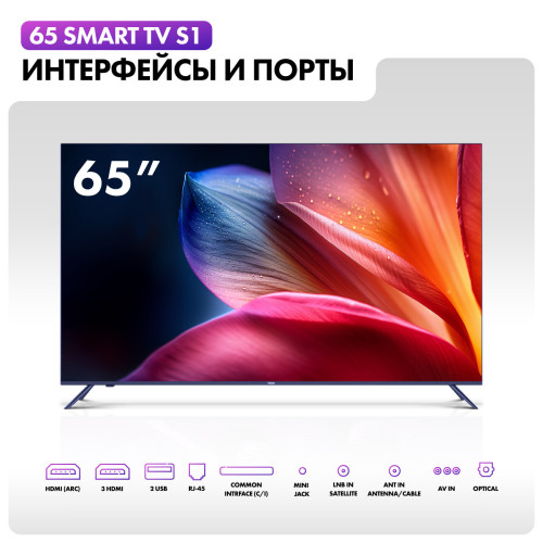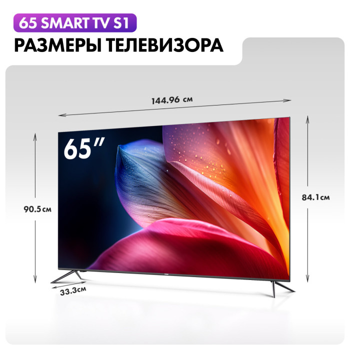 Общие данные: Габариты (без подставки): 84.2х145х8.4 см Габариты (с подставкой): 90.5х145х33.3 см Ширина подставки: 90 см Диагональ: 65"(165.1 см) Разрешение: 3840x2160 Изображение: Формат экрана: 16:9 Частота обновления: 60 Гц Тип технологии HDR: HDR10 Системы обработки изображения: масштабирование до 4K Ultra HD, цифровое шумоподавление Интерфейсы: Разъемы (вход): 4 х HDMI 2.1, 2 х USB 2.0 тип A, 1 х RCA аудио, 1 х RCA аудио/видео, 1 х RCA видео композитный, 1 х 3.5 мм аудио, 1 х 3.5 мм аудио/видео, 1 х DVB CAM, 1 х LAN разъем (RJ45) Разъемы (выход): 1 х 3.5 мм аудио, 1 х выход оптический (Toslink), 1 х 3.5 мм аудио/видео, 1 х RCA аудио, 1 х RCA аудио/видео, 1 х разъем для наушников 3.5 мм Системы вещания: Цифровой тюнер DVB: T/T2/C/S2 Звук: Звук: NICAM стерео Фронтальные акустические системы Количество динамиков: 2 Мощность одного динамика: 10 Вт SMART TV: Встроенный модуль Bluetooth 5.1 Wi-Fi 5 Ггц Операционная система: Android 11 Энергопотребление: Энергопотребление в рабочем режиме: 170 Вт Энергопотребление в режиме ожидания: 0.5 Вт Особенности: Android TV Google Assistant DBX-TV Поддержка Smart TV Технология HDR Запись с ТВ на USB устройство Sleep-таймер Встроенные часы Функция TimeShift Технология HDMI ARC Голосовое управление Защита от детей Настольная подставка Цвет: черный Вес: 16.7 кг Вес без подставки: 16.3 кг Тип батарей пульта ДУ: 2 х AAA