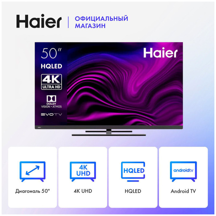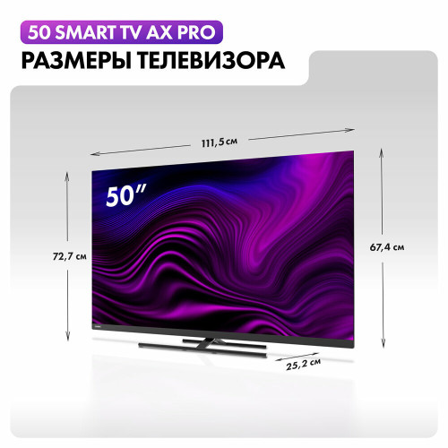 Общие данные: Габариты (без подставки): 67.4x111.6x6.3 см Габариты (с подставкой): 72.7x111.6x25.2 см Диагональ: 50" (127 см) Разрешение: 3840х2160 Яркость: 320 кд/м2 Контрастность: 5000:1 Угол обзора: 178/178 ° Время отклика: 8 мс Разъемы (вход): HDMI 2.1 х 4, USB 2.0 х 2, вход для антенны х 2, композитный, CI+, аналоговый, Ethernet Разъемы (выход): оптический, выход для наушников Изображение: Тип подсветки: QLED Соотношение сторон: 16:9 Частота обновления: 60 Гц Цифровое шумоподавление MEMC HDR 10 Upscaling 4K UHD Системы вещания: Поддержка: DVB-T, DVB-T2, DVB-S2, DVB-C Аналоговый: PAL/SECAM Звук: Тип колонок: стерео Выходная мощность аудио: 24 Вт Dolby Atmos Эквалайзер dbx tv Объемный звук Dolby Digital Decoding SMART TV : Операционная система: Android TV 11.0 Сетевые функции: Wi-Fi, Bluetooth 5.0 Поддержка YouTube Поддержка Netflix Поддержка Google Play Store Особенности: Энергопотребление: 160 Вт Голосовое управление без пульта Far Field Time Shift Таймер Вкл/Выкл Воспроизведение с USB носителя HDMI CEC Родительский контроль Вес: 11.68 кг без подставки, 12.88 кг с подставкой Крепление на стену VESA (мм): 200х200 Внимание: крепление в комплект не входит и приобретается отдельно!