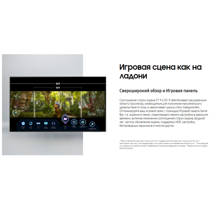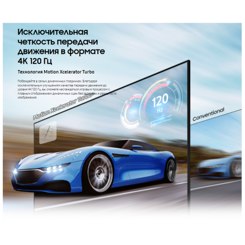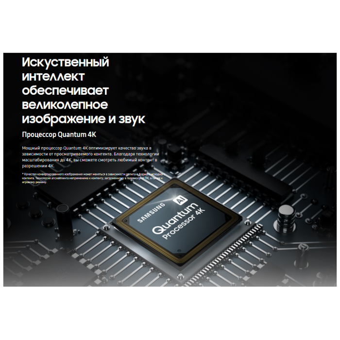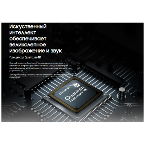 процессор Quantum 4K; расширенный динамический диапазон Quantum HDR; тип затемнения Supreme UHD Dimming; звук, следующий за объектом на экране, OTS Lite; режим Multi-View до 2 видео; проигрыватель и камера 360 VR; игровые режимы ALLM/FreeSync Premium Pro; режим режиссера Filmmaker Mode