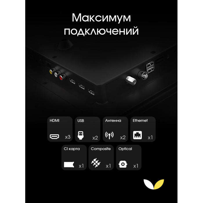 Ethernet - RJ-45, USB Type-A, USB Type-A x 2, вход HDMI x 3, выход аудио цифровой оптический, композитный видеовход, слот CI/CI+, Антенный вход (RF)