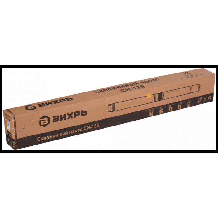 Скважинный насос центробежного типа Вихрь СН-135 предназначен для подачи воды в бытовых условиях из скважин внутренним диаметром от 102 мм, может использоваться также для подачи воды из шахтных колодцев, резервуаров и открытых водоемов для полива садов и огородов. Мощностью насоса составляет 1800 Вт, что позволяет ему перекачивать до 5700 литров воды в час. Забор воды в данной модели осуществляется посередине, между двигателем и блоком импеллеров.