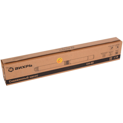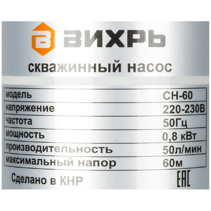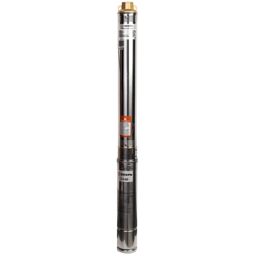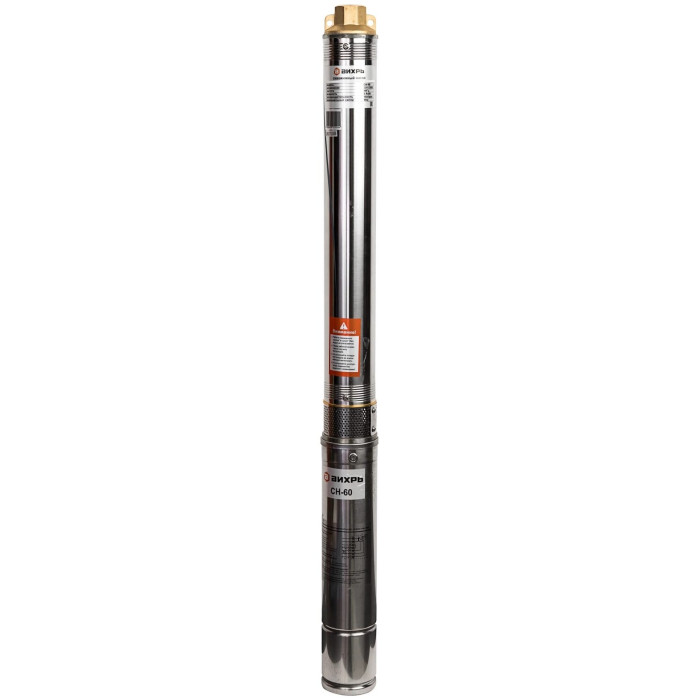 Скважинный насос центробежного типа ВИХРЬ СН-60 предназначен для подачи воды в бытовых условиях из скважин внутренним диаметром от 75 мм, может использоваться также для подачи воды из шахтных колодцев, резервуаров и открытых водоёмов для полива садов и огородов. Мощность насоса составляет 800 Вт, что позволяет ему перекачивать до 3000 литров воды в час. Забор воды в данной модели осуществляется посередине, между двигателем и блоком импеллеров.