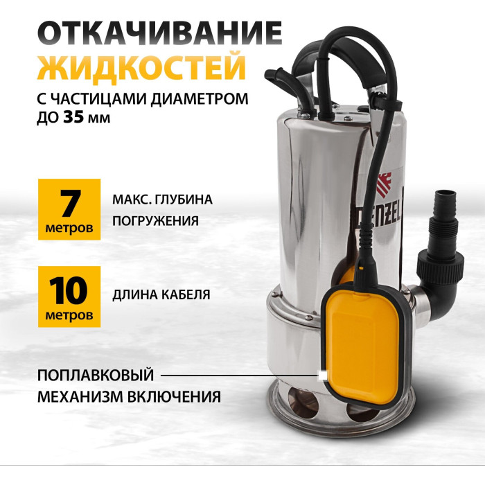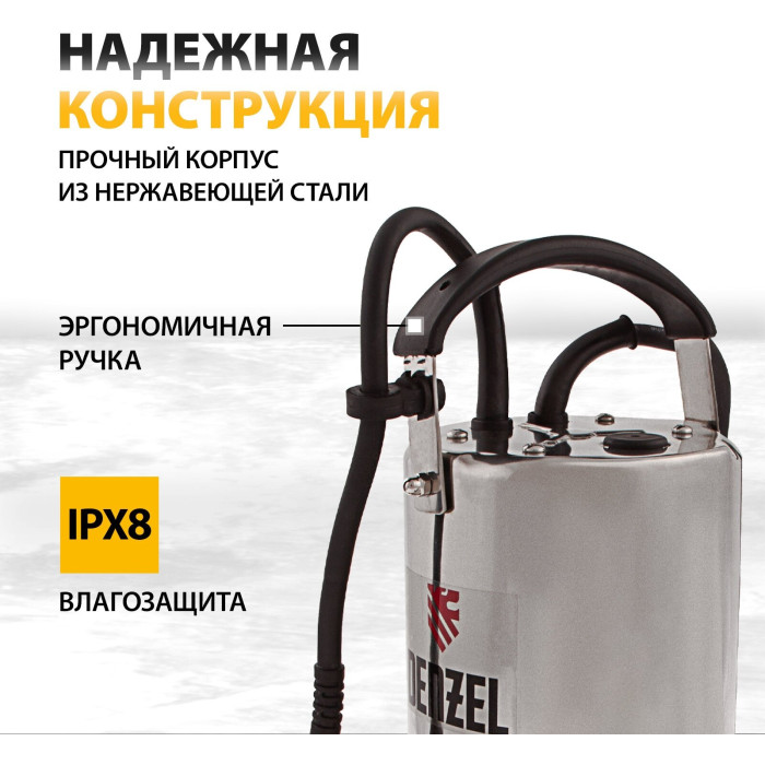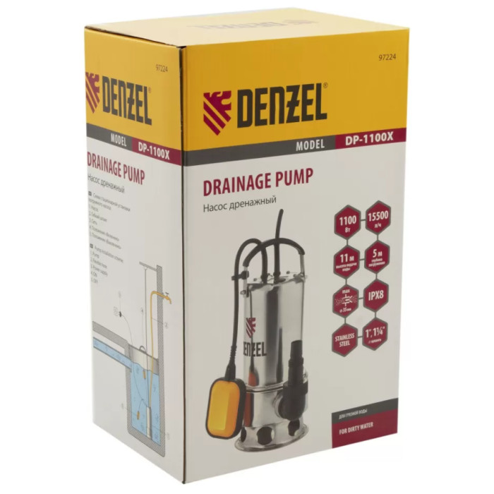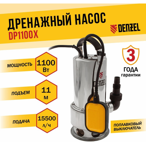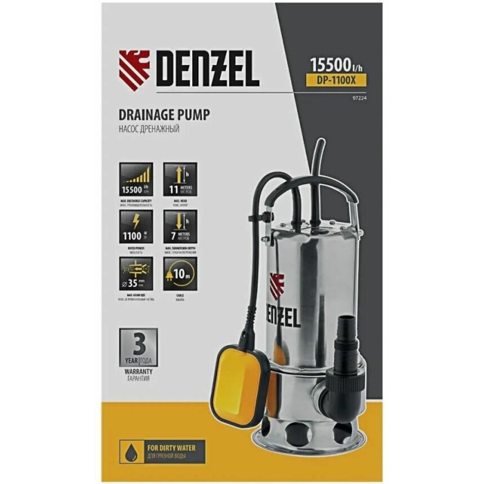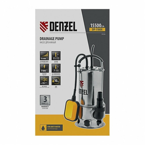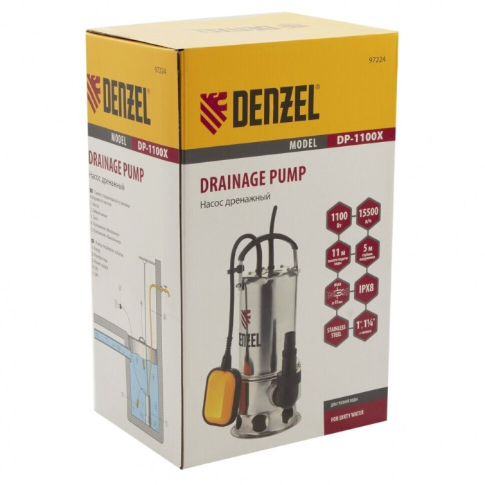 Дренажный насос DP1100X торговой марки DENZEL предназначен для выкачивания воды из подвальных помещений, а также из помещений, подвергаемых затоплению грунтовыми водами. Очень часто его используют при проведении строительных работ. Модель DP1100X мощностью 1100 Вт в течение часа может перекачать до 15 500 (15,5 куб. м) литров жидкости. Насос можно опустить в воду на глубину не более 5 м, при этом он способен осуществлять подачу жидкости на высоту до 11 м.