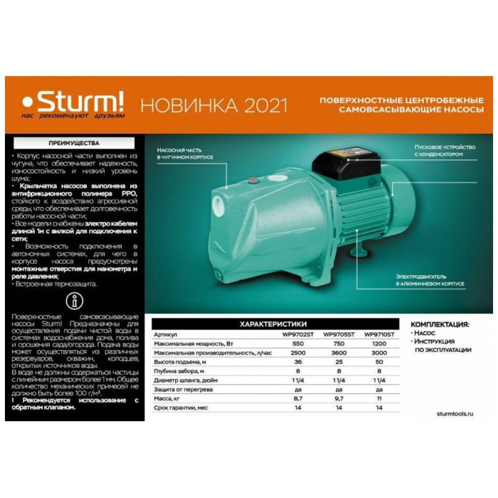 Вихревой насос Sturm WP9705A развивает напор 55 метров. Подачу воды осуществляет с глубины до 8 метров. Устанавливается у водоёма. Оснащен тепловой защитой. Модель используется для перекачки жидкостей, полива сада. Отличается небольшими габаритами и весом.