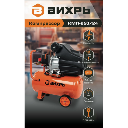 Компрессор Вихрь КМП-260/24 используется для нагнетания сжатого воздуха в различное пневмооборудование в ходе строительно-ремонтных работ в квартире или на даче. Максимальная производительность компрессора 260 литров в минуту, объем ресивера 24 литра. Комплектуется опорными ножками и смазочным маслом.