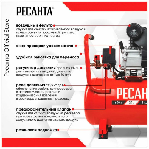 поршневой компрессор, электрический двигатель, масляный, 1.60 кВт, давление 8 бар, производительность 230 л/мин, коаксиальный (прямой) привод, объем ресивера 24 л, кол-во цилиндров: 1