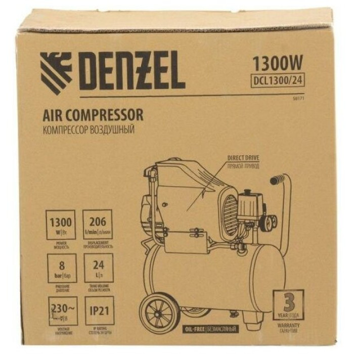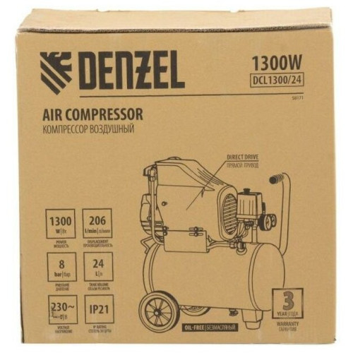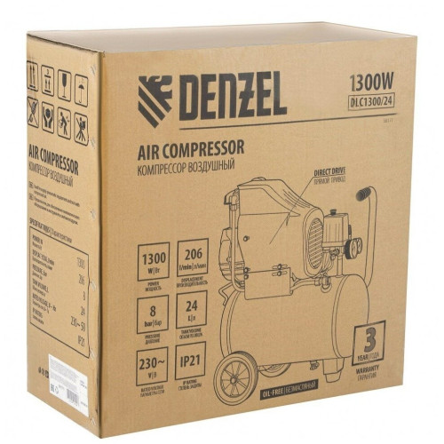 Компрессор воздушный DLC1300/24 безмасляный 1.3 кВт, 24 литра, 206 л/мин Denzel