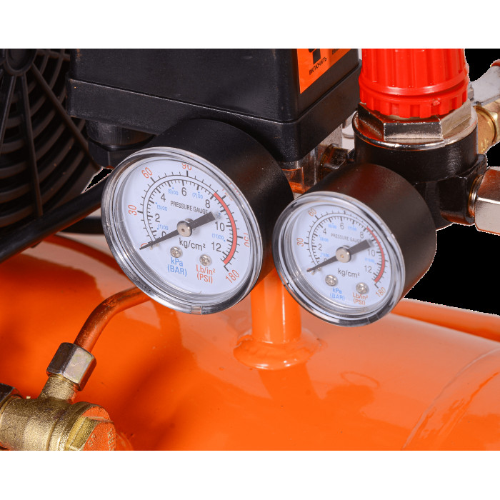 защита от перегрева, манометр, предохранительный клапан, регулировка давления, ручка для переноски, Низкий уровень шума, без примесей масла, не требует замены масла, удобная ручка, чистый воздух, эффективное туннельное охлаждение