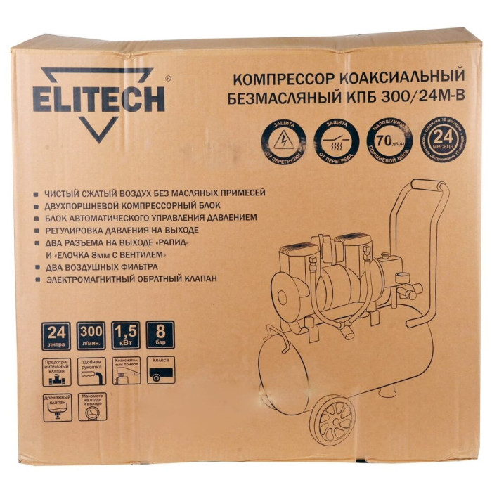 Изделие: Компрессор; Мощность, Вт: 1500; Габариты, мм: 600х560х300; Вес, кг: 20.5; Объем товара, м3: 0.1008; Тип двигателя: Электрический; Напряжение, В: 220; Давление, бар: 8; Производительность, л/мин: 300; Ресивер, л: 24; Тип компрессора: Поршневой безмасляный; База: Колесная; Количество цилиндров: 2; Количество ступеней сжатия: 1; Тип соединения: рапид (EURO);