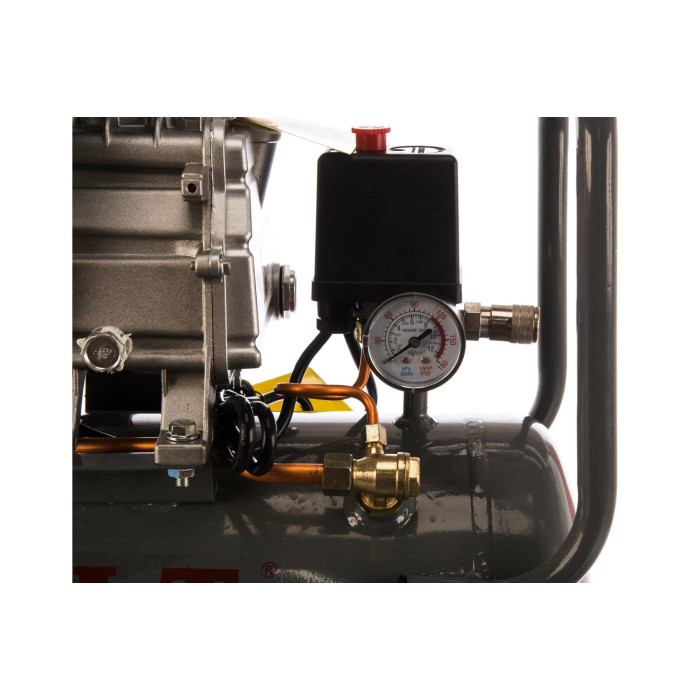 Отличный выбор для мастерской или стройки. Подходит для накачки, продувки, покраски, забивания скоб и других задач. Прост в обращении и мобилен. Многофункциональный аппарат, может использоваться с широким спектром пневматического инструмента и аксессуаров. Обладает высокой мощностью, рабочее давление - 8 бар. Ресивер объемом 24 литра обеспечивает продолжительную работу. Все узлы управления и мониторинга удобно расположены в одном месте. Для удобства перемещения по рабочей площадке компрессор оснащен колесами большого диаметра. Преимущества: Прямой привод - надежная передача крутящего момента от двигателя к цилиндрам. Точная работа - для контроля и регулировки рабочего давления предусмотрены редуктор и манометр. 1 разъем рапид (EURO) для подключения и быстрой смены пневмоинструмента без дополнительных переходников. Автоматическое отключение двигателя, когда давление в ресивере достигает 8 бар и включение при снижении давления. Применение: для сжатия воздуха и подачи его под давлением