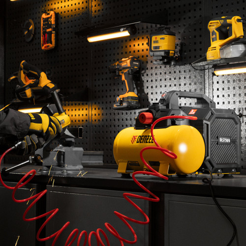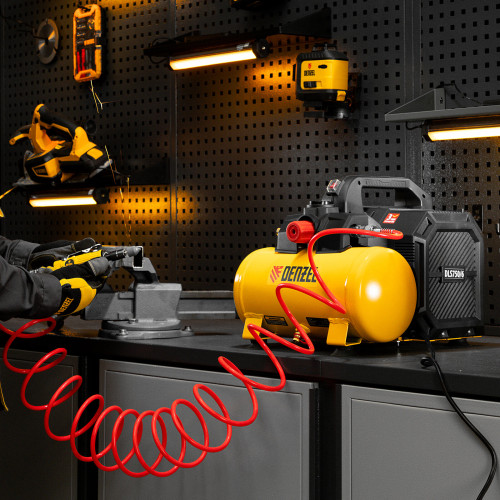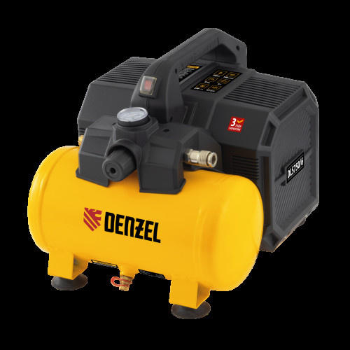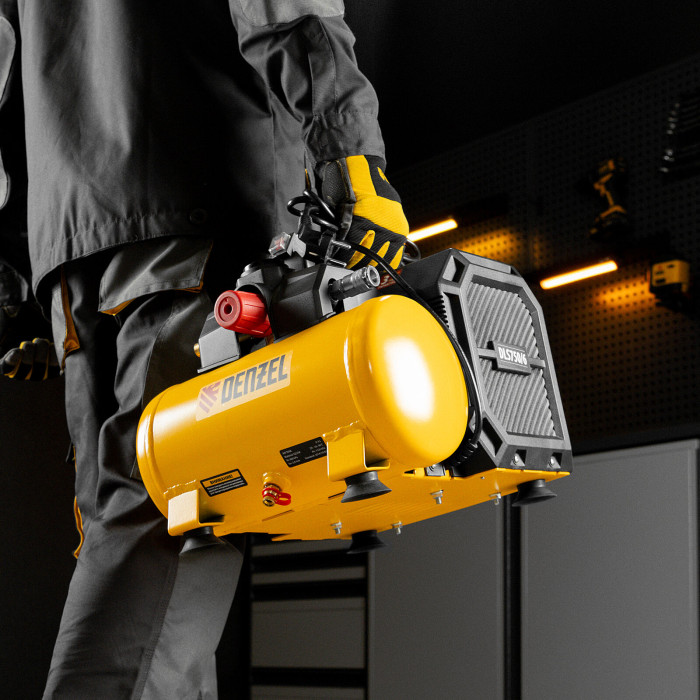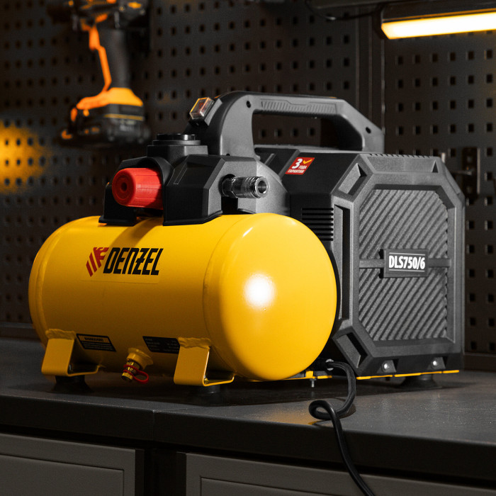 Компрессор безмасляный малошумный Denzel DLS750/6 58019 мощностью 750 Вт, с ресивером объемом 6 л, имеет производительность на входе 140 л/мин и предназначен для обеспечения пневмоинструмента сжатым воздухом. Оптимален для работы с краскораспылителем и продувочным пистолетом, т. к. воздух на выходе не содержит частиц масла. Рабочий узел закрыт сплошным кожухом, благодаря чему уровень шума во время работы не превышает 65 дБ. Компрессор можно использовать в жилом помещении и на дачном участке. Преимущества Автоматическая регулировка производительности — прессостат останавливает работу компрессора, как только давление в ресивере достигает 8 бар, а при его падении ниже 6 бар снова запускает двигатель. Безопасная эксплуатация — производитель предусмотрел клапан сброса избыточного давления. Удобный контроль давления в ресивере — на компрессор установлен механический манометр, «смотрящий» вверх, поэтому для снятия показаний не нужно присаживаться. Термозащита — в случае превышения допустимой температуры двигатель останавливается для предотвращения поломки. Высокое качество очистки воздуха — бумажный фильтр эффективно задерживает посторонние частицы и снижает сопротивление воздушному потоку. Долгий срок службы — цилиндры с антифрикционным покрытием устойчивы к износу. Быстрая подготовка к работе — благодаря быстросъемному коннектору Рапид (Евро) подключение пневмоинструмента занимает несколько секунд. Минимальный уровень вибраций в сравнении с масляными аналогами — компрессор установлен на резиновые опоры-присоски. Комфортное перемещение — вес составляет 16 кг, в верхней части кожуха имеется удобная рукоятка. Гарантия 3 года — высокое качество компрессора подтверждено производителем.
