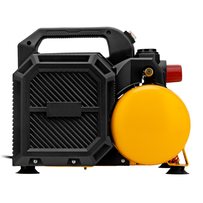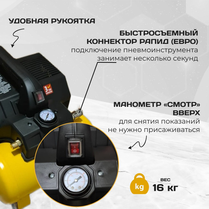 Автоматическое отключение по достижению заданного давления, Защита от перегрузок, Низкий уровень шума, Рукоятка для переноски, защита мотора от перегрева, компактный размер, малый вес, минимальная вибрация по сравнению с масляными компрессорами, можно использовать в жилом помещении, регулятор давления и манометр для контроля расхода воздуха и давления, сплошной кожух для дополнительного снижения шума