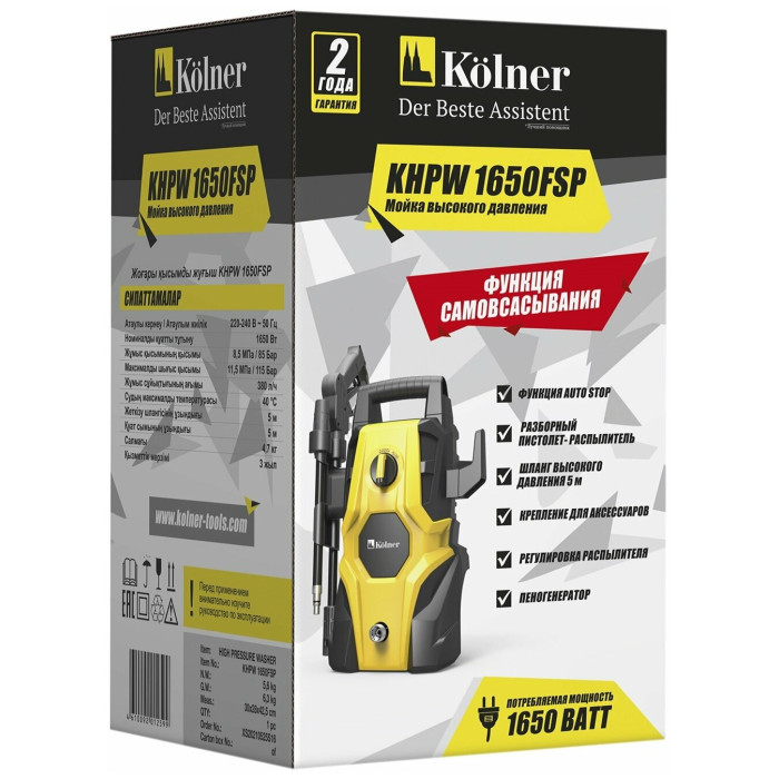 тип двигателя: электрический, максимальное давление: 115 бар, напряжение сети: 220–230 В, мощность: 2.24 л.с., Мощность, Вт : 1650, производительность: 380 л/ч, материал помпы: алюминий, конструктивные особенности: ручка для переноски, транспортировочные колеса, встроенный бак для моющего средства, бак для воды, дополнительные функции: защита от перегрева, использование моющего средства, забор воды из емкости, фильтр тонкой очистки, подключение к системе водоснабжения, регулировка давления на ручке, насадки: стандартная насадка, пеногенератор, грязевая фреза, длина шланга высокого давления: 5 м
