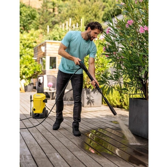 встроенный бак для моющего средства, ручка для переноски, транспортировочные колеса, Адаптер для садового шланга, Встроенный фильтр для воды, Забор воды из емкости, Защита от перегрева, Использование моющего средства, Подключение к водопроводу, Регулировка давления, Телескопическая ручка