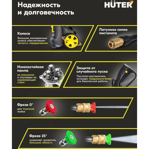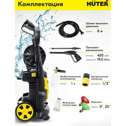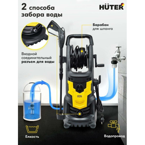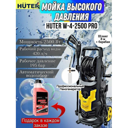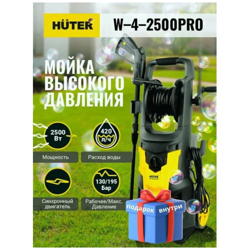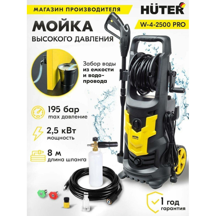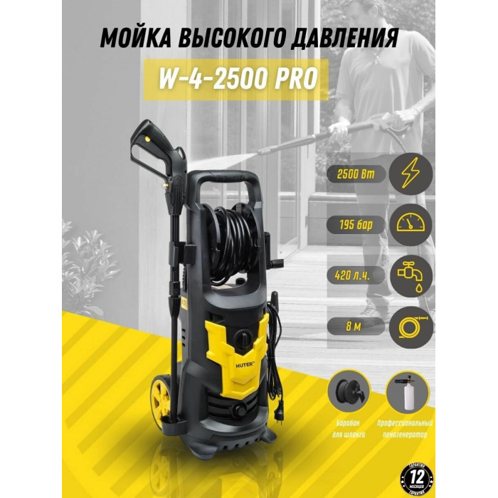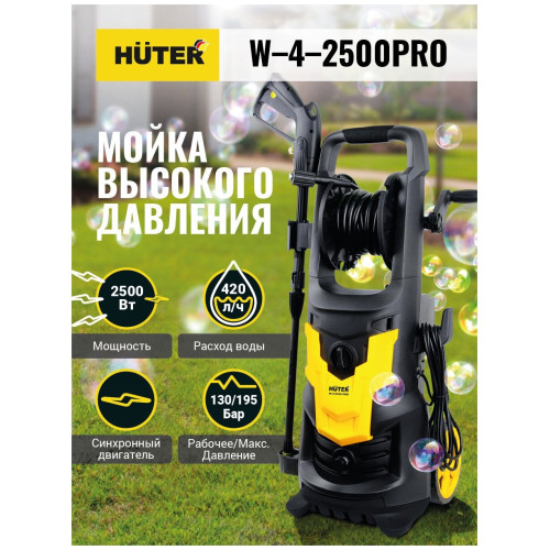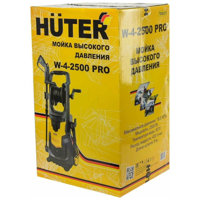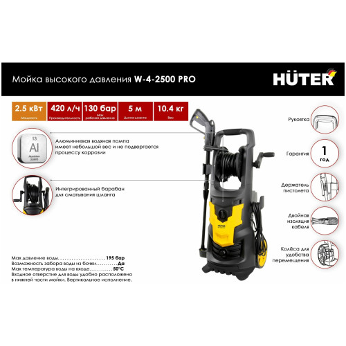 Мах рабочее давление, бар 130 Max давление воды, бар 195 Мощный мотор Вертикальное исполнение Алюминиевая помпа Барабан для наматывания шланга высокого давления Наличие колес облегчает транспортировку Huter W-4-2500 PRO 70/8/31 Держатель пистолета