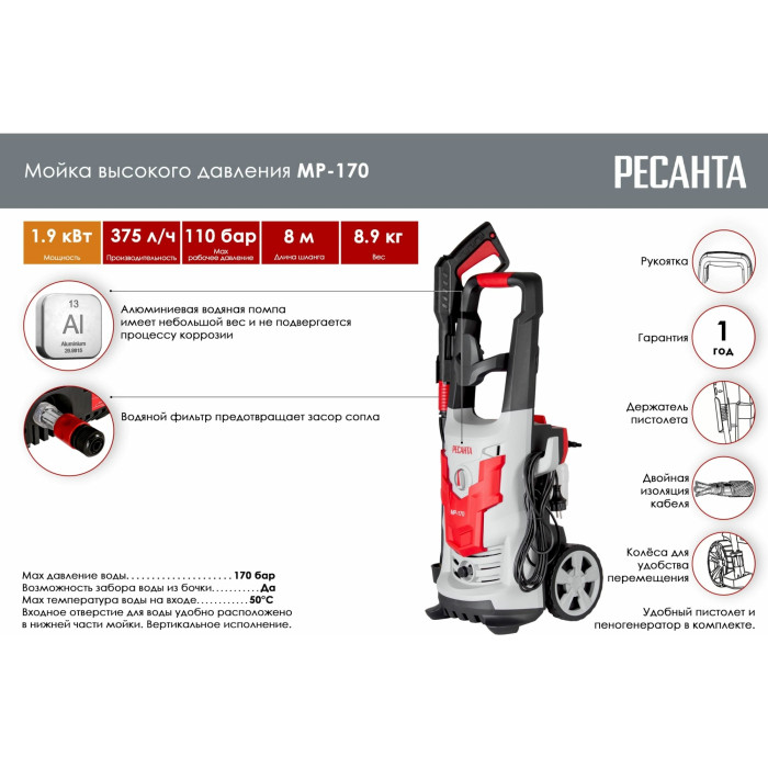Мойка Ресанта МР-170 используется для эффективной очистки различных поверхностей, автотранспорта, садовых дорожек и прочего. Эргономичный пистолет-распылитель обеспечивает надежный хват и дает полный контроль над процессом. Возможность забора воды из емкости позволяет использовать аппарат на участке без водопровода. Компактные размеры и малый вес обеспечивают высокую мобильность мойки, а наличие колес упрощает её перемещение по территории.