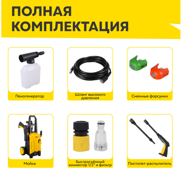 мойка высокого давления - 1 шт, пистолет-распылитель разборный - 1 шт, шланг высокого давления - 1 шт, пеногенератор - 1 шт, игла для очистки сопла - 1 шт, сменные форсунки - 1 шт, фильтр - 1 шт, быстросъёмный коннектор для шланга подачи воды - 1 шт, паспорт - 1 шт