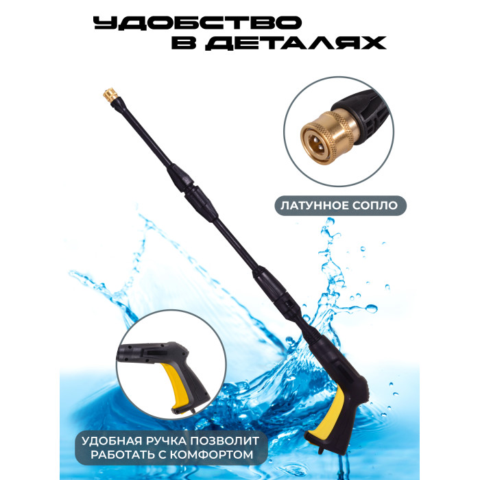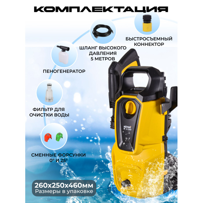 мойка высокого давления - 1 шт, пистолет-распылитель разборный - 1 шт, шланг высокого давления - 1 шт, пеногенератор - 1 шт, игла для очистки сопла - 1 шт, сменные форсунки - 1 шт, фильтр - 1 шт, быстросъёмный коннектор для шланга подачи воды - 1 шт, паспорт - 1 шт
