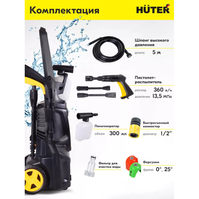 Мойка высокого давления; Пистолет-распылитель разборный; Шланг высокого давления; Пеногенератор; Игла для очистки сопла; Фильтр для очистки воды; Быстросъёмный коннектор для шланга подачи воды; Руководство по эксплуатации.