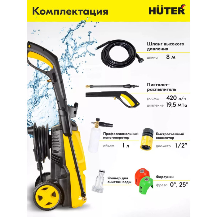 Мойка высокого давления. Пистолет-распылитель разборный. Шланг высокого давления. Пеногенератор. Игла для очистки сопла. Сменные форсунки. Фильтр. Быстросъёмный коннектор для шланга подачи воды. Руководство по эксплуатации.