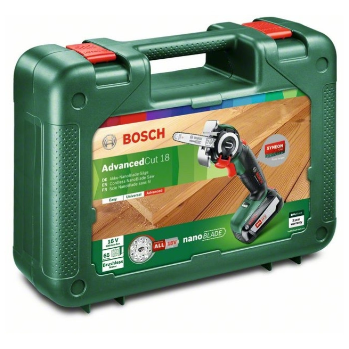 nanoBLADE Wood Speed 65, прозрачный защитный кожух для пильного полотна, 1 аккумуляторный блок PBA 18V 2.5Ah W-B, зарядное устройство AL 1830 CV, петля для хранения, кейс