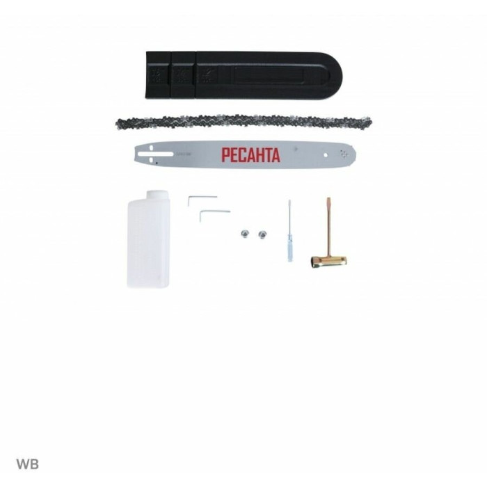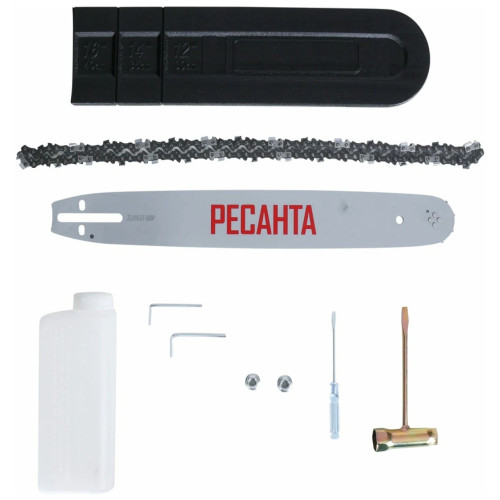 бензопила — 1 шт., шина — 1 шт., цепь — 1 шт., защитный кожух шины — 1 шт., емкость для смешивания топливной смеси — 1 шт., паспорт продукции — 1 шт., комплект инструментов и принадлежностей – 1 шт.