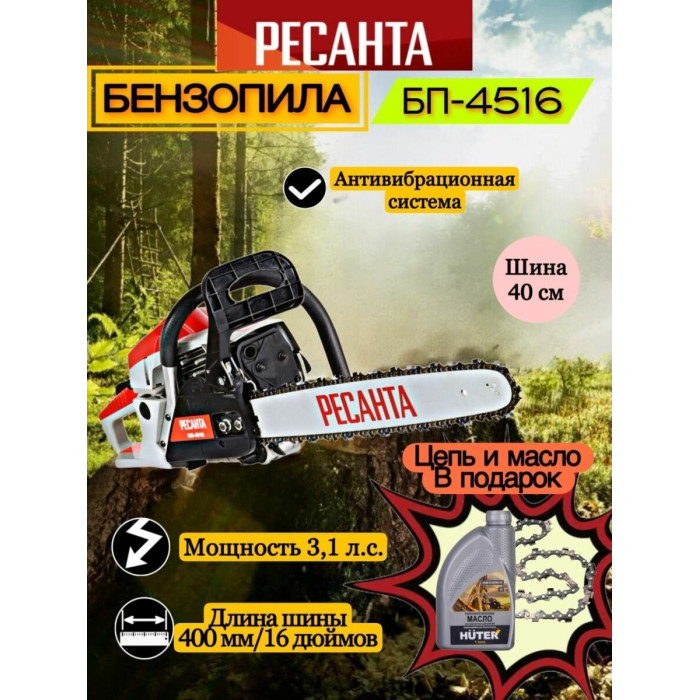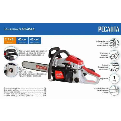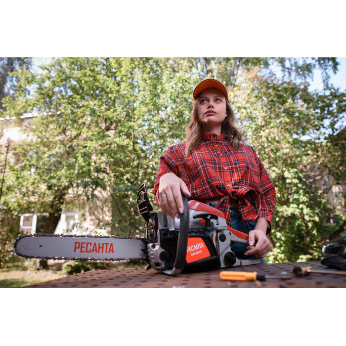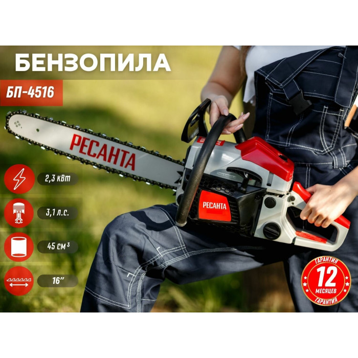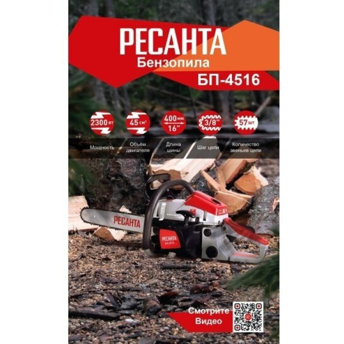 Бензопила Ресанта БП-4516 - инструмент, использующийся для валки деревьев, заготовки дров, распиловки бревен и бруса, обрезки веток в саду.