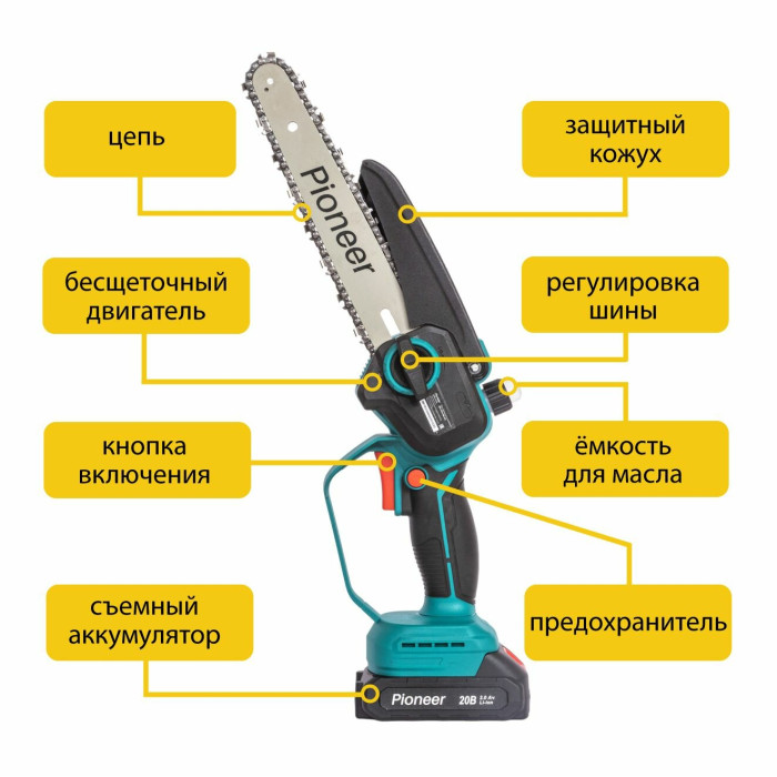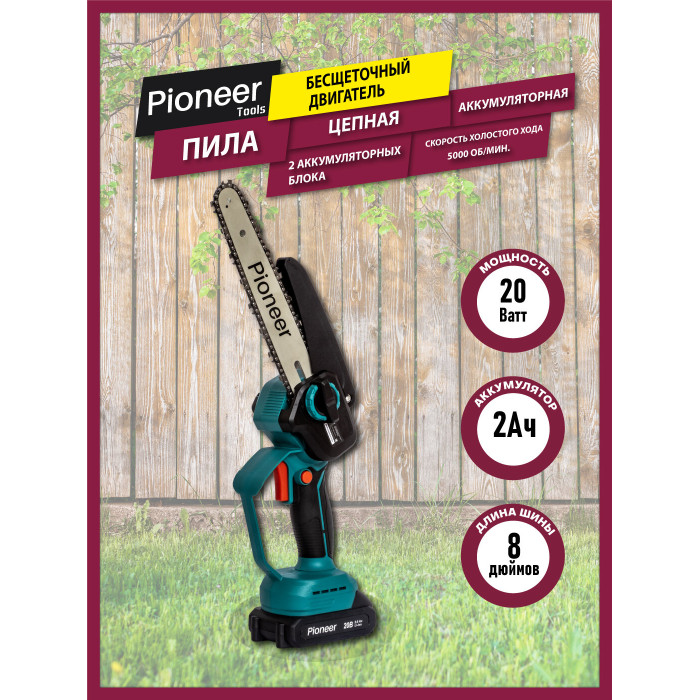 пила; направляющая шина 8 дюймов; пильная цепь для шины 8 дюймов; 2 аккумуляторных блока; зарядное устройство; руководство по эксплуатации; гарантийный талон.