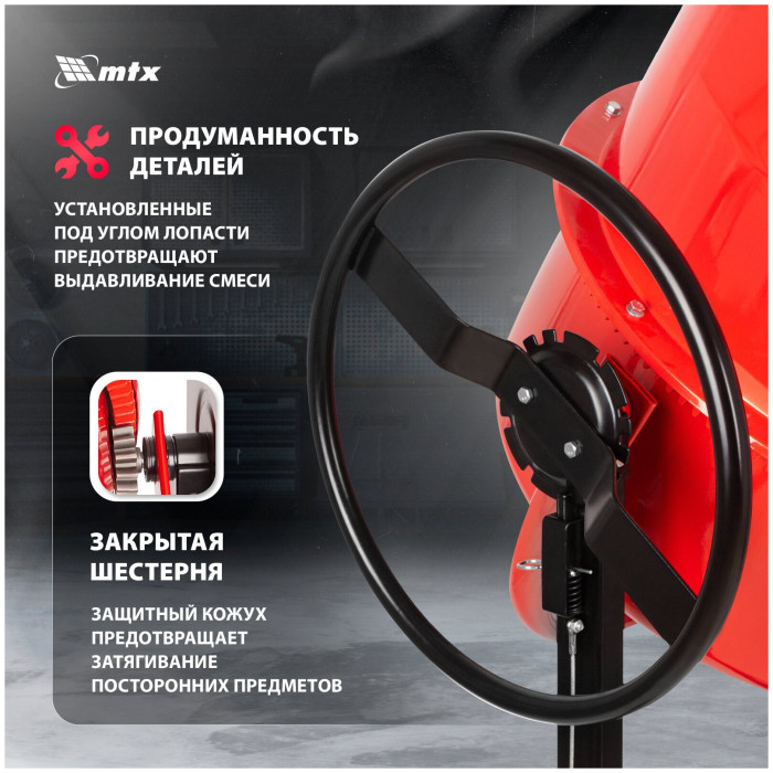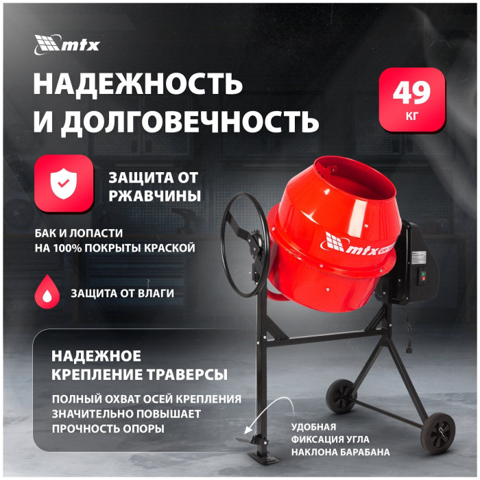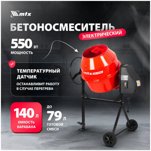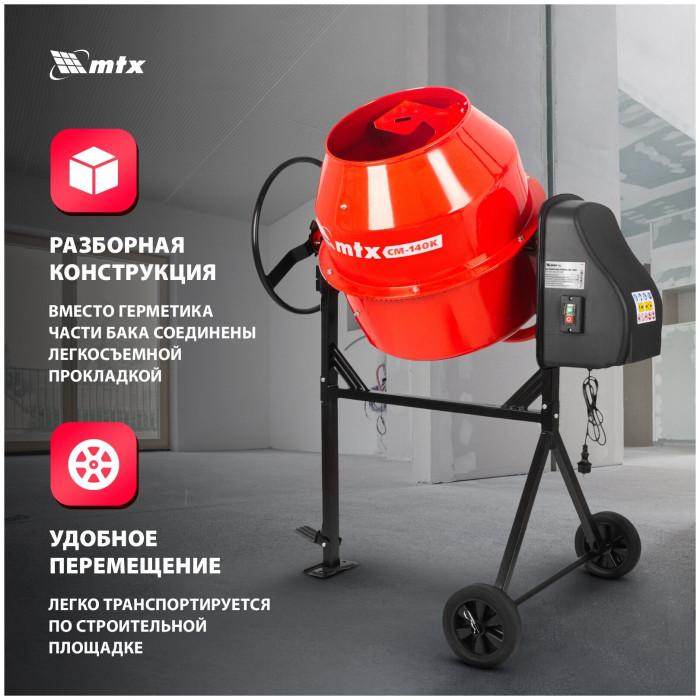 Барабан емкостью 140 л обеспечивает до 79 л готовой смеси на выходе,что позволяет использовать мешалку МТХ СМ-140K на небольших строительных площадках. Широкая форма грушевидного барабана позволяет добиться качественного смешивания растворов для таких работ как укладка кирпича и плитки,заливка стяжек. Установленные под углом лопасти исключают выдавливание смеси наружу и ее потерю. Преимущества: Защита электромотора от перегрева – температурный датчик останавливает работу при перегреве,тем самым сохраняя целостность обмотки и предотвращая поломку двигателя. Защита от влаги – кожух из мягкого пластика закрывает кнопки управления,это повышает безопасность работы. Надежная опора – рама усилена замкнутым квадратным профилем из прочного металла и подкосами с ребрами жесткости. Это позволяет сохранить прочность всей конструкции.