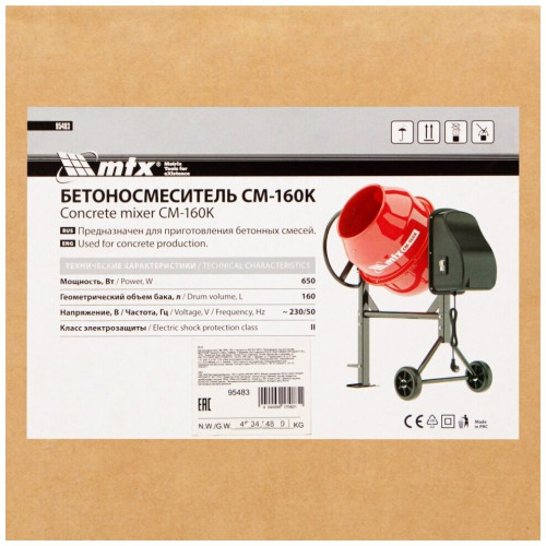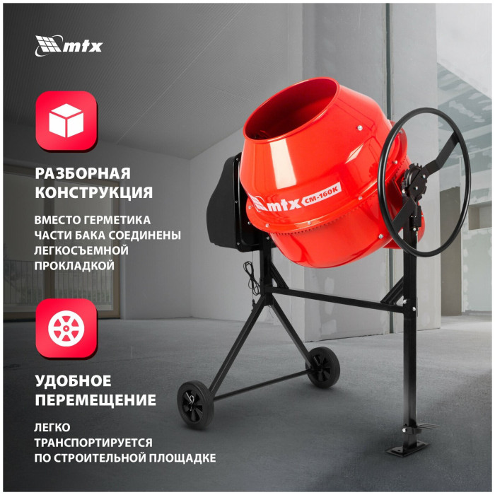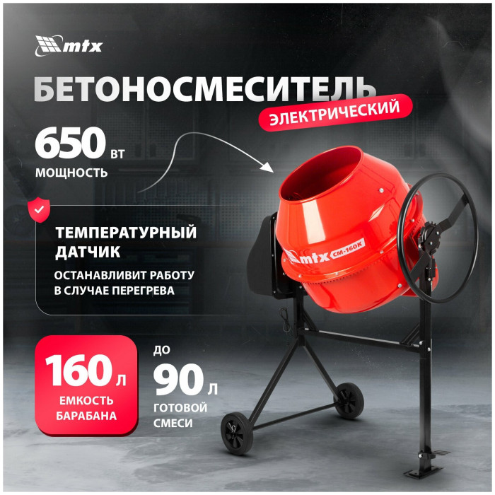 Бетоносмеситель МТХ СМ-160K может использоваться как на собственном участке,так и на небольших объектах для ремонтных,строительных,отделочных работ. Ёмкость бака составляет 160 л,что позволяет получать на выходе до 90 л готовой строительной смеси. Мешалка отличается простотой и надежностью. Фиксатор штурвала позволяет наладить дозированную подачу смеси. Преимущества:Влагозащита – кнопки управления закрыты защитным кожухом от попадания воды и грязи,что повышает безопасность работы . Термозащита – в случае перегрузки двигатель моментально останавливается,это обеспечивает сохранность внутренних узлов и продлевает срок службы всего оборудования.