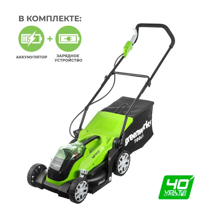 тип двигателя: аккумуляторный, напряжение аккумулятора: 40 В, функция мульчирования, объем травосборника: 40 л, максимальная высота скашивания: 32 мм
