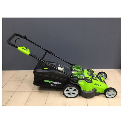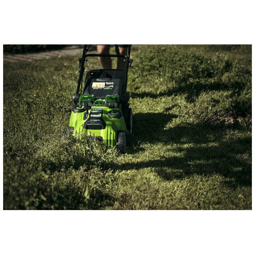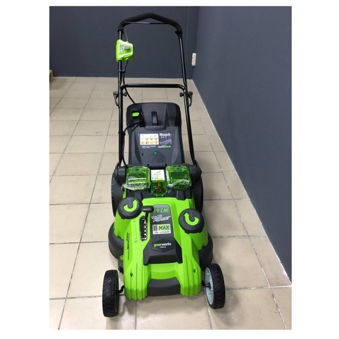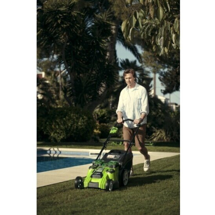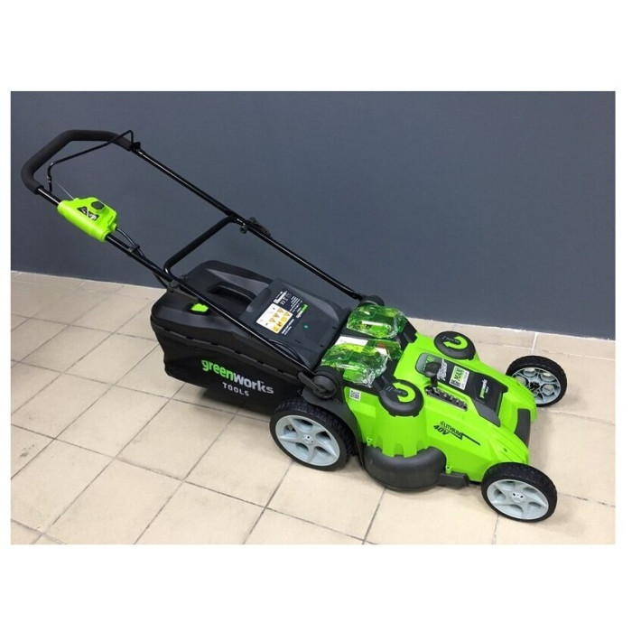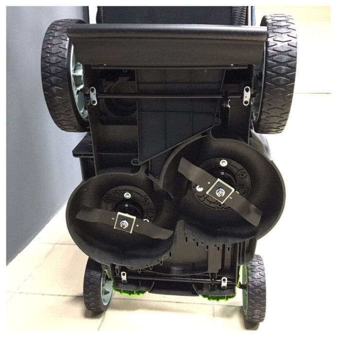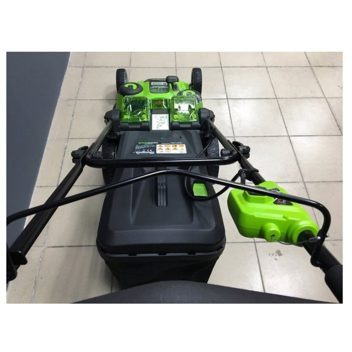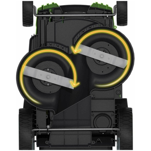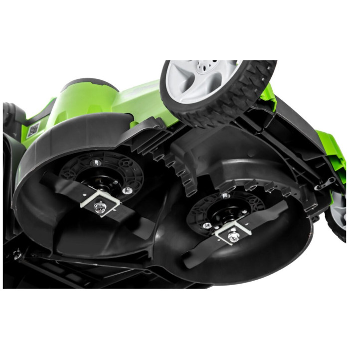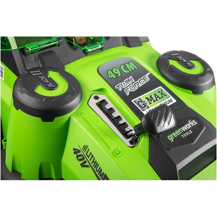Газонокосилка аккумуляторная G-MAX 40V GREENWORKS G40LM49DB2K на текущий момент это сверх новая и уникальная конструкция среди аналогов. Газонокосилка оснащена сразу 2-мя двигателями, 2-мя лезвиями и 2-мя отсеками для батарей. Лезвия на деки расположены не параллельно и вращаются в противоположных направлениях, благодаря чему создается аэродинамический эффект восходящего потока, который поднимает траву непосредственно перед моментом среза. Двигатели на данной модели имеют высокие обороты (5000 об/мин), что упрощает процесс кошения травы и увеличивается коэффициент мульчирования.