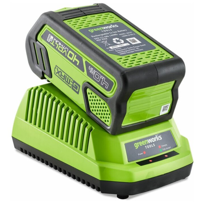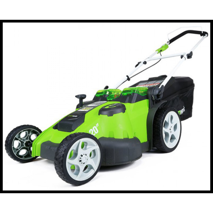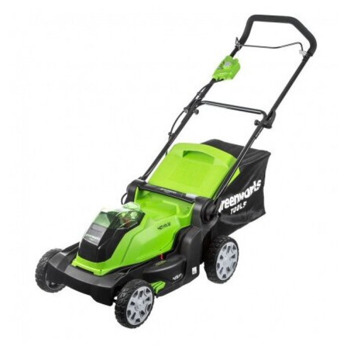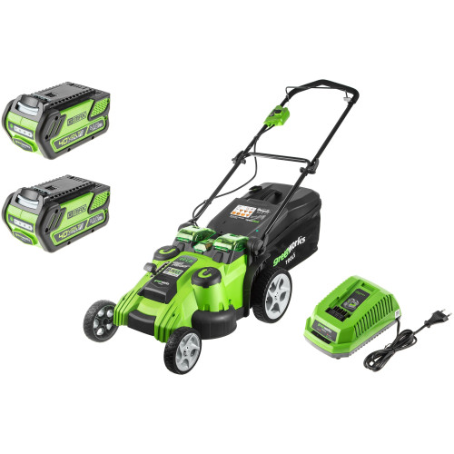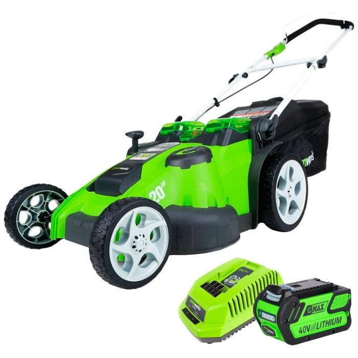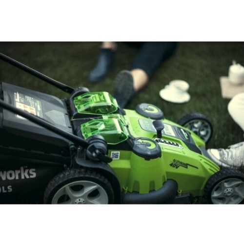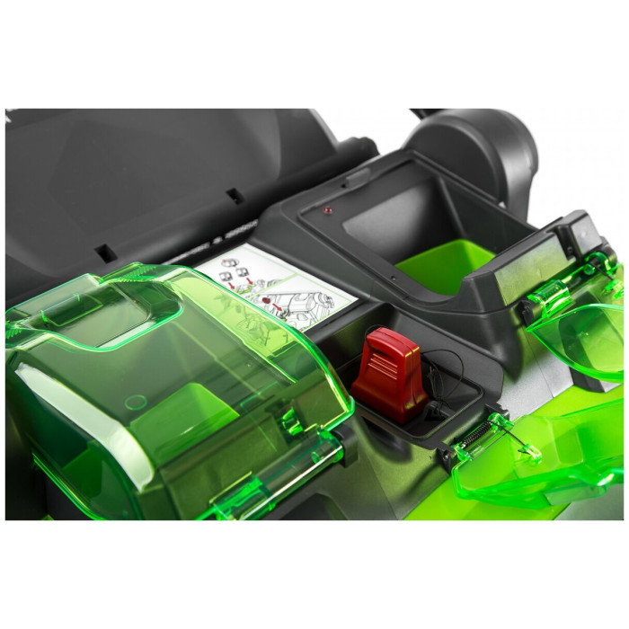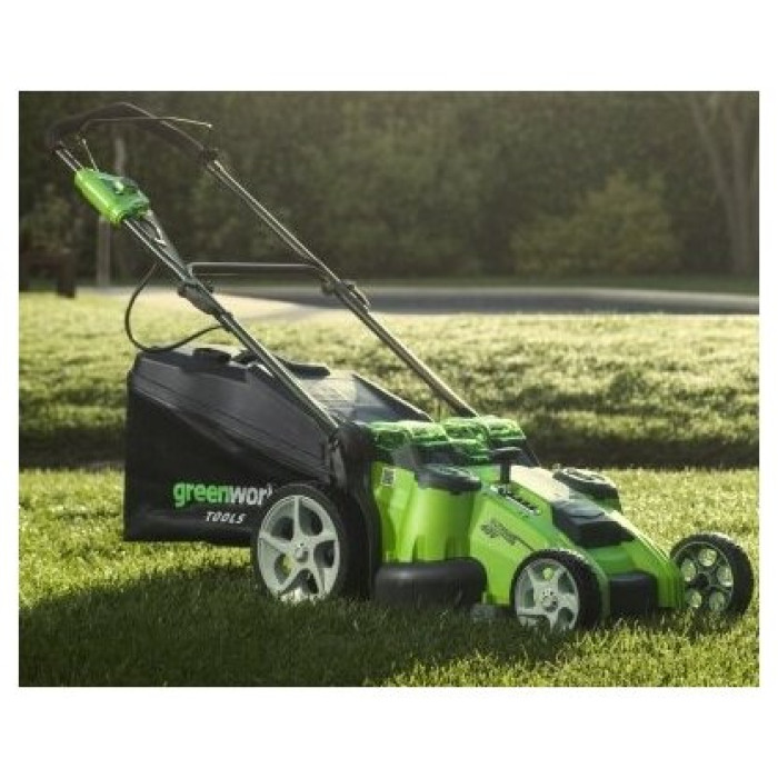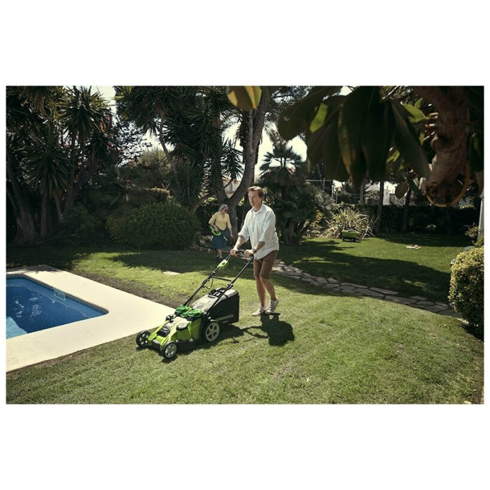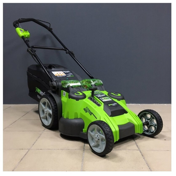Газонокосилка аккумуляторная G-MAX 40V GREENWORKS G40LM49DB2K на текущий момент это сверх новая и уникальная конструкция среди аналогов. Газонокосилка оснащена сразу 2-мя двигателями, 2-мя лезвиями и 2-мя отсеками для батарей. Лезвия на деки расположены не параллельно и вращаются в противоположных направлениях, благодаря чему создается аэродинамический эффект восходящего потока, который поднимает траву непосредственно перед моментом среза. Двигатели на данной модели имеют высокие обороты (5000 об/мин), что упрощает процесс кошения травы и увеличивается коэффициент мульчирования.