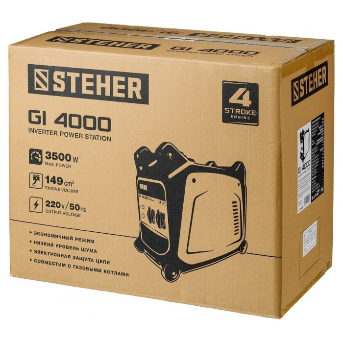 Бензиновый инверторный электрогенератор STEHER GI - 4000, предназначен для электроснабжения торговых объектов, для работ на стройке или в качестве резервного электроснабжения летнего дома. За счет бака 5,7 л может непрерывно работать в течение четырех часов. Шумозащитный корпус значительно снижает шум двигателя. Идеальное качество вырабатываемого тока позволяет использовать станцию для питания любых электронных устройств без стабилизатора. Дополнительный выход на 12В дает возможность подзарядки аккумуляторов. Совместим с газовыми котлами. Специальный экономичный режим. Компактность и небольшой вес расширяют возможности его применения. Защита при низком уровне масла. Четырехтактный двигатель с раздельными системами питания и смазки. Встроенная электронная защита цепей принудительно отключает станцию в случае короткого замыкания или превышения допустимой нагрузки. Низкий уровень шума благодаря закрытому корпусу и шумоизолирующим панелям. Кабель с клеммами для зарядки батарей в комплекте.
