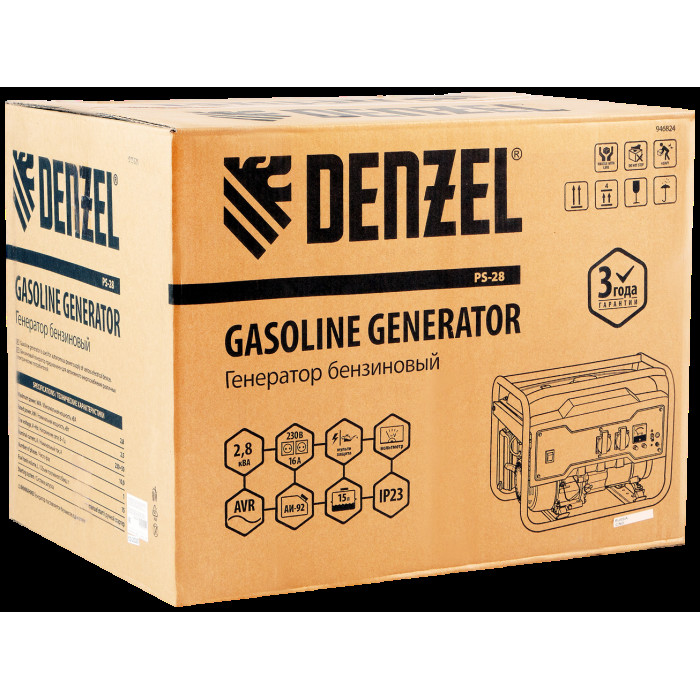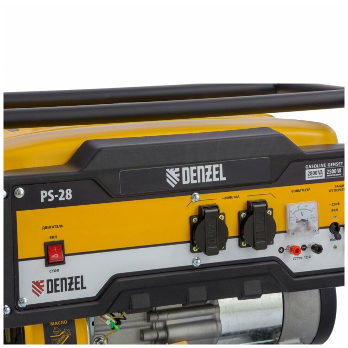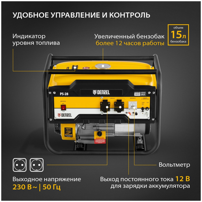 Экономичный и простой в использовании генератор бензиновый Denzel PS 28 с ручным стартером отлично подойдет для дачного участка, строительной площадки, домашней мастерской, кемпинга, рыбалки. Мощность генератора Denzel 2,8 кВт (напряжение 230 В) позволяет одновременно подключать к нему несколько приборов, например, электрочайник, холодильник и 3 лампы дневного освещения. Благодаря увеличенному бензобаку на 15 л устройство будет работать более 12 часов без дозаправки. Экономичный и надежный четырехтактный двигатель мощностью 7 л.с. снижает выхлопы, расход топлива и уровень шума.