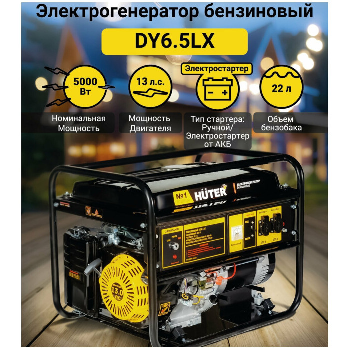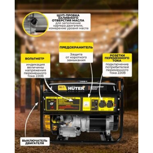 Электрогенератор (бензогенератор) - электрическая машина, предназначенная для автономного электроснабжения. В качестве первичного двигателя используется четырёхтактный карбюраторный двигатель, топливом для которого является неэтилированный бензин. Электрогенератор предназначен для получения электроэнергии в тех местах, где отсутствует магистральное электроснабжение. Это касается, как частных домов, где генераторы могут использоваться в качестве резервного источника питания, так и различных участков работ, где нужно электропитание для оборудования и проведения работ. Электрогенераторы HUTER много лет являются лидерами на российском рынке. Генераторы отличаются высоким качеством и надёжностью. Преимущества: • Защита от перегрузки. • Защита от отсутствия и недолива масла. • Защита от короткого замыкания. • Медная обмотка альтернатора • Система регулировки оборотов позволяет экономить топливо и ресурс. • Проверенные временем надёжные двигатели. Тип стартера Ручной Тип расположения Бензиновый Номинальная частота переменного тока, Гц 50 Коэффициент мощности 1 Количество фаз 1 Способ запуска Ручной стартер Тип топлива Бензин АИ-92 Гарантия 1 год Тип генератора Синхронный, щёточный Ёмкость бензобака, л 22 Максимальная мощность, Вт 5500 Номинальная мощность двигателя, л. с. 13 Колёса и ручки Возможна установка Мощность, Вт 5000 Номинальное напряжение, В 220